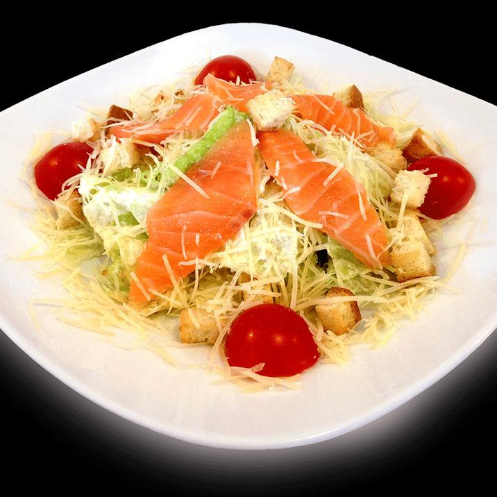 Лосось, пекинская капуста, пармезан, соус цезарь, томаты черри, сухарики