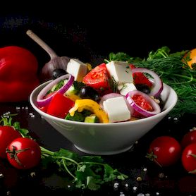 Cыр фета, огурец, томат, перец болг., маслины, лук репчатый, заправка для салата (масло подсолнечное, соевый соус, уксус).